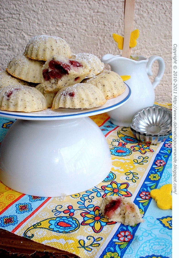 Kakva egzotika od tako finih sastojaka. Skoro sam od mame dobila 40 kalupića za šapice, slične su ovim, i nikako da ih isprobam. Višnje su odlične u kombinaciji, a badem, puter, pa još mak. Prelepo Majo!