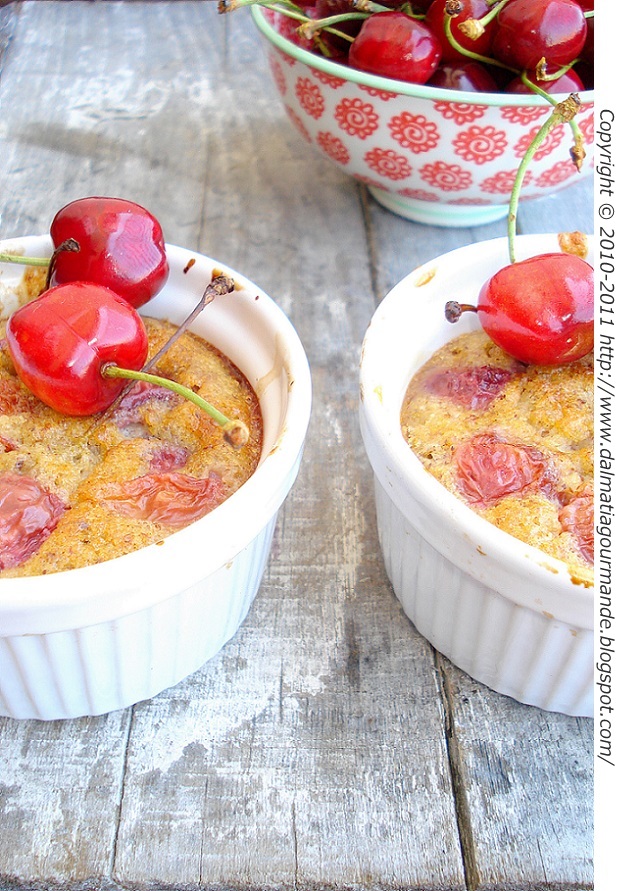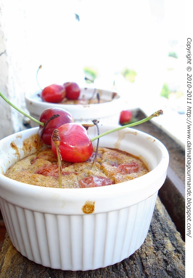 Kući sam donijela tek malenu porciju svježih trešanja, a sjetila sam se divnog deserta koji sam davno vidjela kod Bée, a kojeg sam željela probati. U nedostatku pojedinih namirnica, nešto sam sitno promijenila, nešto dodala, nešto oduzela, te dobila savršeni desert bez brašna, a kojeg smo za sekund smazali!