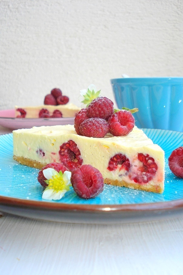 part of cheese cream. Arrange fresh raspberries on top of the cheese, and in the end pour the rest of the