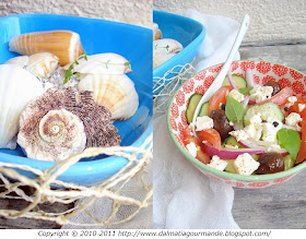 Kada je među bogovima došlo do svađe kome pripada Atika, Zeus je odlučio dodijeliti tu nagradu onome tko stanovnicima daruje najvrijedniji dar. Bog mora Posejdon iz morske pjene je stvorio brzog konja, a božica mudrosti Atena koplje iz kojeg izraste drvo masline. Bogovi presudiše u Ateninu korist. Uz domaće masline, svježe ubrane rajčice i krastavce iz našeg vrta, odlučila sam napraviti Grčku salatu. Jednostavan prilog koji se služi s većinom grčkih obroka, zahvaljujući blagoj mediteranskoj klimi obiluje svježim voćem i povrćem te tradicionalnim Feta sirom. Nakon cjelodnevnog kupanja i prženja na suncu na plaži Okruga Gornjeg te pokojeg ispijenog sokića u obližnjim kafićima na plaži te pojedenih sladoleda, salata nam je na kraju večeri došla kao spas! |