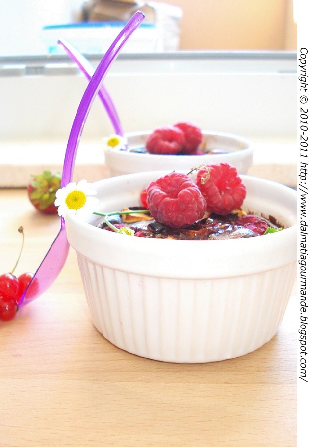 Odlično! Maline u čokoladnom clafoutisu - moram probati. Samo, nije mi baš jasna uloga komadića jabuke u toj priči i nadam se da neću pogriješiti ako ih izostavim.