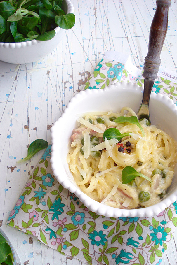 alla papalina (Spaghetti with Prosciutto, Pecorino cheese and Peas)
