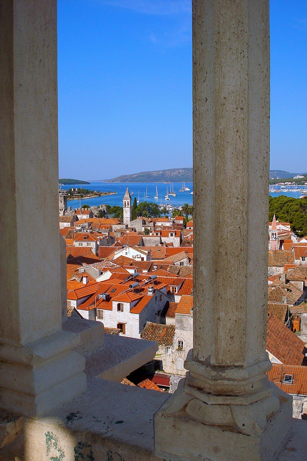 pogled na narančaste krovove trogirskih kamenih kuća...